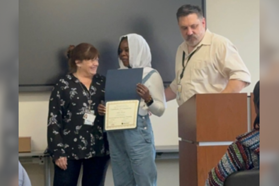 N'Gnyoh displays her certificate of completion at the conclusion of her UPMC Pathways to Work course.